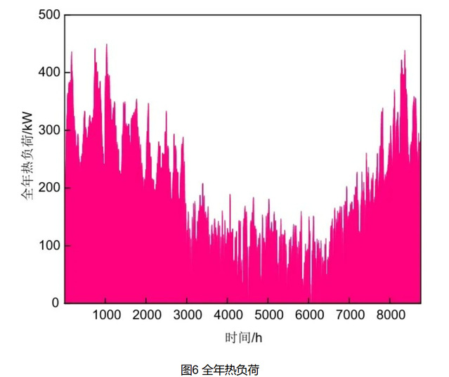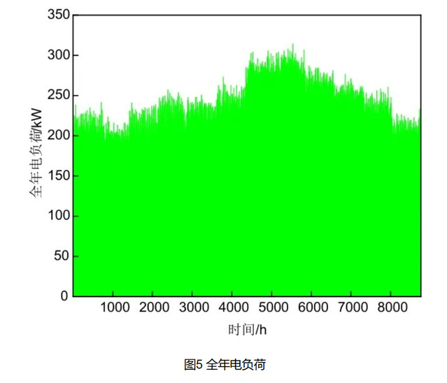 本文利用HDY-SMAD软件进行负荷模拟,充分考虑建筑能耗、工业活动能耗、生产生活能耗,得到全年8760 h的热、电负荷数据,如图5和图6所示。12月至次年2月最高热负荷达到450 kW,其余热负荷处于较低水平;6月至8月的电负荷显著高于9月至次年2月的电负荷,最高电负荷达到315 kW。