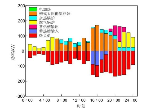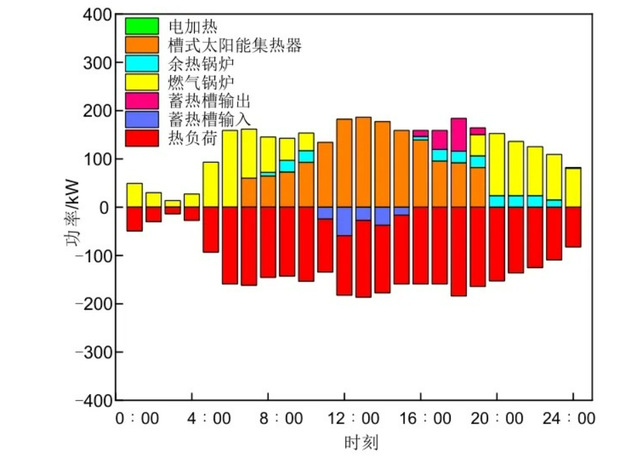 图13为最优配置方案下冬季典型日的供热子系统出力图。由于过渡季典型日电负荷和热负荷都适中,在充分利用风光资源的前提下,由清洁能源槽式太阳能集热器优先供热,余热锅炉和燃气锅炉作为补充热源。11∶00—15∶00槽式太阳能集热器供热可以完全满足热负荷的需求,多余的热量存储在蓄热槽中;16∶00—19∶00采用蓄热单元放热进行热量补充;8∶00—10∶00、16∶00—23∶00余热锅炉进行热量补充,最大出力为24.08 kW;19∶00—次日10∶00燃气锅炉进行热量补充,燃气锅炉最大出力为159.13 kW。