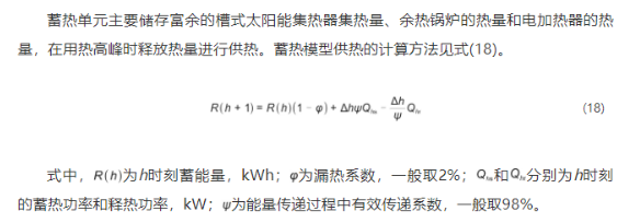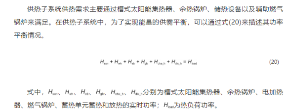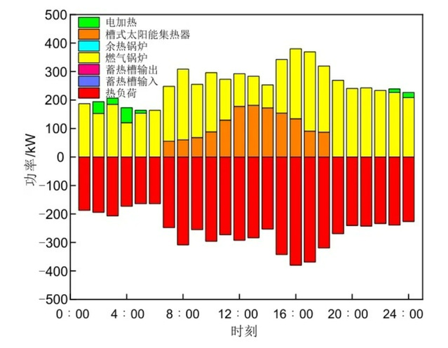 系统供热时,以槽式太阳能集热系统作为主热源,余热锅炉、电加热器为辅助热源,燃气锅炉为备用热源。用热低谷时,可再生能源产生的热量直接供用户使用,槽式太阳能集热系统、余热锅炉、电加热器产生的多余热量储存于蓄热单元;用热高峰时,槽式太阳能集热系统、余热锅炉、电加热器、蓄热单元产生的热量供给不足时,由燃气锅炉补充。