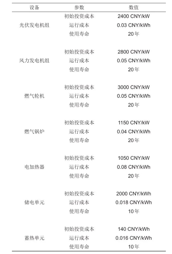 注:本文定义的运行成本涵盖了系统的日常运行、人力成本等折算后的费用,而天然气使用设备的消耗费用则单独计算。在表格中提及的燃气轮机和燃气锅炉运行成本不包含天然气的用气成本。