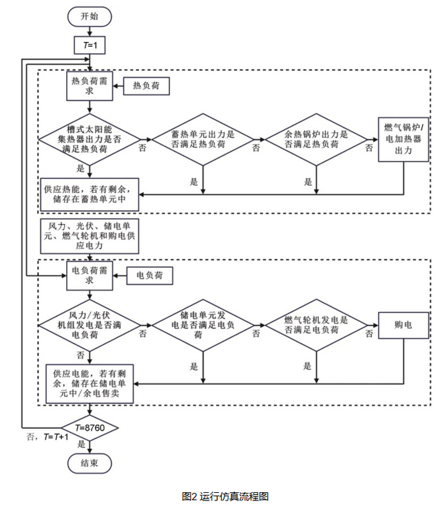 图2为多能互补能源系统协调优化仿真流程。供热子系统需要满足供热负荷,并将多余的热量储存于蓄热单元中。当槽式太阳能集热器无法满足热需求时,蓄热单元释放热量进行补充;若热负荷仍未得到满足,则启用余热锅炉,若仍不足,进而启动燃气锅炉和电加热器。供电子系统负责满足系统的供电需求。对比风力发电、光伏发电和燃气轮机产生的电量与系统的供电需求,储能系统依据内部运行策略执行充电或放电操作,而电网作为供电系统的辅助电源,确保在电量过剩或不足时进行供电的买卖。
