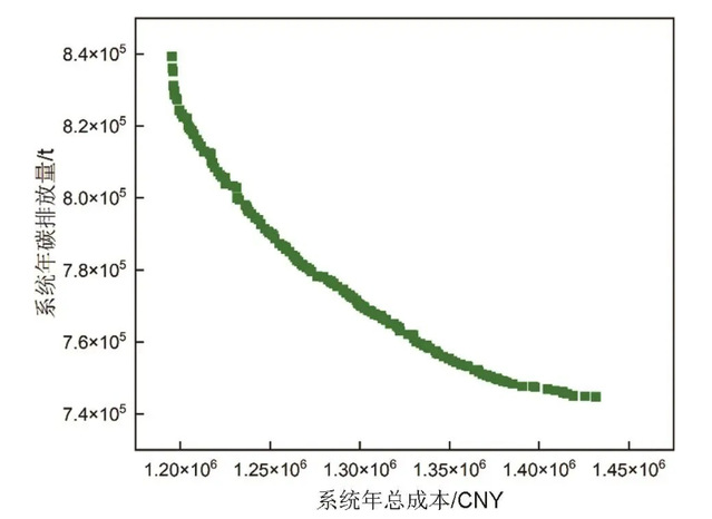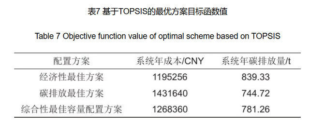 (2)基于NSGA-Ⅱ的多目标优化规划模型产生了155组属于帕累托前沿的解集,通过TOPSIS决策分析方法得到了的综合性最佳容量的配置方案,该方案相较于仅考虑经济性的方案,碳排放量降低了6.92%,相较于仅考虑碳排放量的方案年成本降低了11.41%。