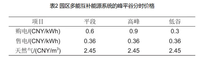 系统配置容量的优化通过设定两类参数进行:一类为经济技术参数,另一类为优化参数。所采用的多能互补能源系统的天然气价格为2.45 CNY/m2,以天然气的低热值9.78 kWh/m3为基础进行功率转换。关于能源系统的具体分时价格参见表2。