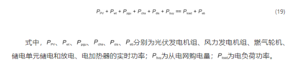 供电系统旨在满足终端用户即需求方的供电负荷,其中电能的主要来源包括风力发电、光伏发电及燃气轮机。风力发电机组和光伏发电机组的发电能力受到风速和太阳辐射强度的直接影响。同时,储能电池根据综合能源系统内部的负荷差异以及预先设定的充放电策略进行操作,调整了多能互补能源系统内部的负荷平衡,进而在供电子系统与外部电网之间进行有效互动与调节。在供电子系统中,功率平衡的维持可以通过式(19)表示。