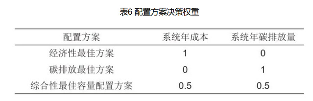 对获得的帕累托前沿解集进行标准化处理,消除量纲的影响;之后设置配置方案决策权重,从而最终确定容量最佳匹配方法。本文以经济性与碳排放量作为计算指标制定目标函数,两者重要性一致,权重均设为0.5。此外,设定了两个对照组,一个对照组偏向于经济性(权重设为1,0),另一个偏向于最小化碳排放量(权重设为0,1)。3种权重配置方案的详细信息见表6。