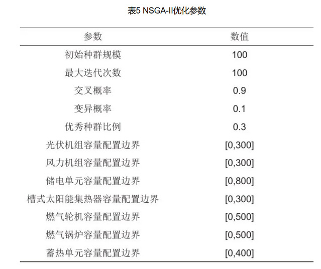 在本文中,系统的模拟仿真时间为8760小时,以1小时为时间步长;采用了NSGA-Ⅱ进行多目标优化,初始种群规模设为100,最大迭代次数限制为100次,交叉概率定为0.9,变异概率设定为0.1,以及优秀种群比例定在0.3,具体优化参数可见表5。