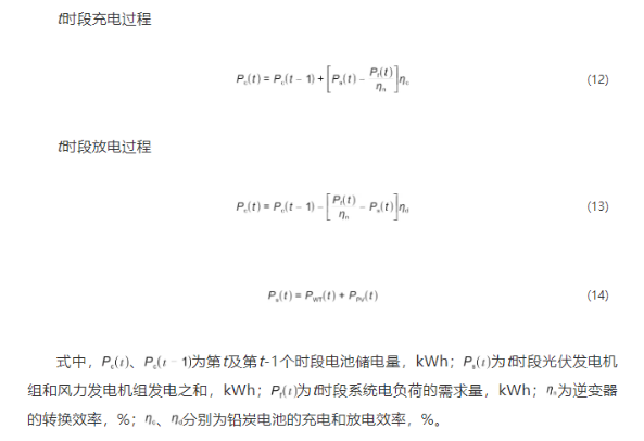 储电单元种类丰富,与传统铅酸电池相比,铅炭电池通过在铅酸电池负极中加入活性碳材料来提高电池的性能,循环寿命提高了3倍,充电速度提高了8倍,放电功率提高了3倍,具有性价比高、安全稳定等优点。考虑到放电性能、使用寿命和安全稳定性等方面,选用铅炭电池。铅炭电池的充电和放电过程的数学模型计算方法见式(12)~(14)。