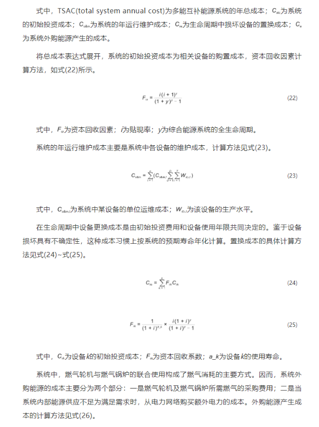 随着多能互补能源系统的发展,优化目标也随之多样化,不仅关注单目标优化,而且多目标优化也是研究的热点之一。梅书凡等提出了一种考虑可再生能源出力和负荷需求季节性波动的储能优化配置方法,从储能全生命周期收益和风光综合利用率角度对储能的容量和功率进行优化配置。结果表明,此方法不仅可保障储能经济性,还可进一步提升可再生能源利用率。张歆蒴等以弃风弃光量最小和梯级水电蓄能最大为目标构建优化调度模型,通过改进逐步优化算法进行了大型风光水互补发电优化调度研究,结果表明利用梯级水电站的调蓄能力可以有效调节补偿大规模的风电和光电出力波动。黄文龙等构建包含光伏、风电及储能的并网多能互补能源系统,通过部分市网供电及“隔墙售电”消纳改进其容量配置和调度优化模型,对园区的全生命周期碳排放量进行计算,确定系统经济性和碳排放参数的影响规律。邵志芳等构建含风力、光伏、火电、储电单元、电解制氢、燃料电池的多能互补供电系统模型,以系统运行累计净现值最大为优化目标,同时考虑系统运行稳定性和负荷满足率,利用量子粒子群算法求解,对系统组件进行容量配置优化。结果显示,优化配置后的多能互补供电系统具有较好的经济性和负荷曲线一致性。吴克河等把新能源和储能装置当成微型单元,通过整合并网系统内的所有单元,在确保发电单元输出稳定以及满足物理和能源利用效率的约束条件下,运用遗传粒子群算法给出了在给定容量下发电单元的最佳配置方案。谭岭玲提出多能互补型微电网的结构,在约束条件中加入失负荷率对微电网进行配置。在上述文献研究中,以等值年总成本作为规划配置的优化目标,采用粒子群算法,进行多能互补型微电网的最优配置,解决了微电网双目标冲突的问题。但是,大多从单一角度出发,对能源系统的优化设计未能综合考虑系统总成本和碳排放量;或尚未考虑设备采用不同装机容量对系统综合运行成本的影响,或采用的是传统容量优化配置方法,并未提出多种不同容量优化配置方案对系统综合运行成本进行对比分析。