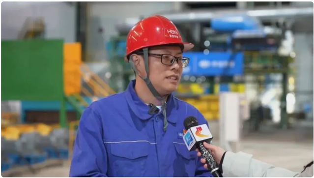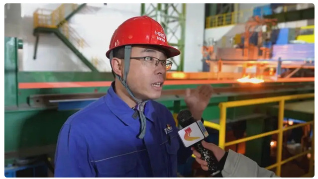 在我身后,一块汽车钢板坯正缓缓走下生产线,这是全球首条氢冶金绿色汽车板连铸生产线,今天投产后生产的第一块汽车钢板坯。