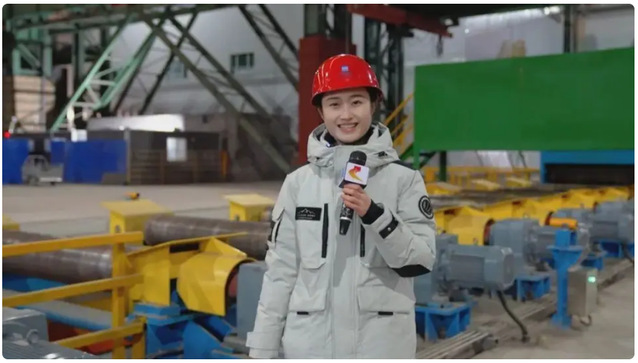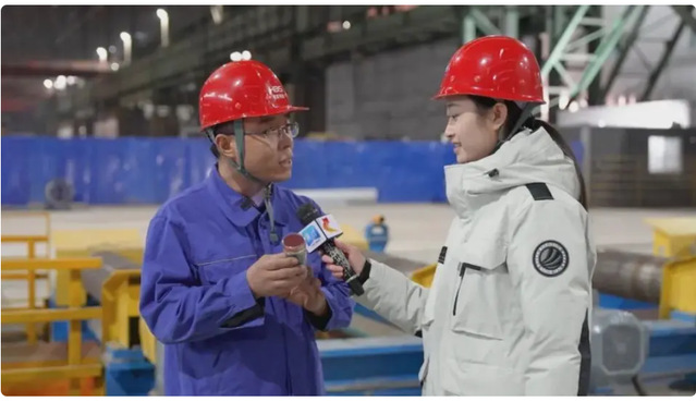 我身后的这套切割系统,是咱们绿色板坯氢氧切割系统,通过用绿电电解水,产生氢气(来)燃烧,较甲烷的话,减少二氧化碳的产生,实现它的切割的这种小工艺的绿色的目的。