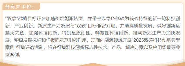 面向能源领域企事业单位、科研院所以及园区等机构的低碳零碳负碳科技创新,重点围绕能源清洁化利用、新能源、储能、氢能、低碳工业流程再造、固废综合利用、绿色交通、建筑节能及生态固碳增汇等领域的标志性技术、产品、解决方案以及应用场景,选树典型,示范引领。