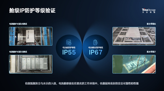 基于电芯安全,天合储能从原料入手,开发了极致安全的活性材料,隔膜以及电解液,保障产品本征安全性。基于系统级安全,天合储能采用防水、防火、防腐等高防护材料和高强度硬件设计,通过IP55/C5防护等级测试,使产品无惧各种恶劣环境。