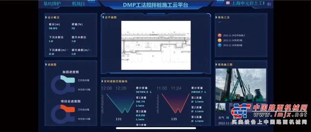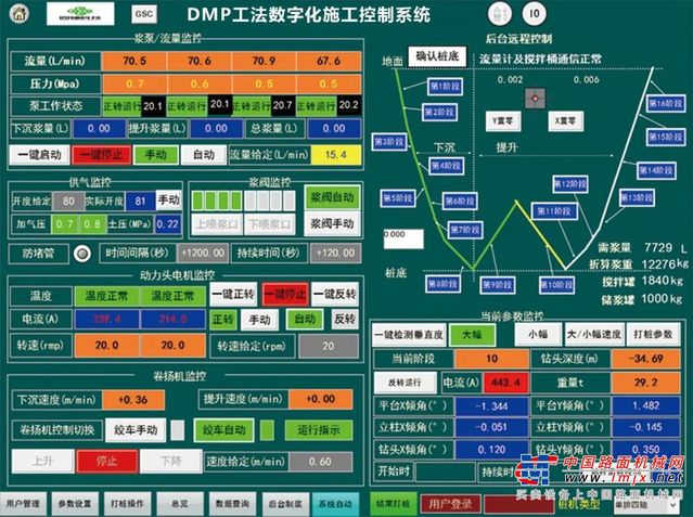 DMP工法搅拌桩设备采用智能的数字化施工控制系统,使得施工过程质量可控,大幅度提高了施工的便捷性,数字化施工控制系统采集并显示的内容包括喷浆压力、浆液流量、喷气压力、地内压力、成桩深度、成桩速度、成桩垂直度等参数;可生成包含桩长、施工时间、地内压力、水泥用量、成桩垂直度等参数的施工记录表;同时可将施工参数上传至集控中心,实现对施工过程的实时监控。