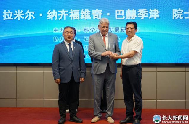 精彩的报告结束后,副校长江厚顺向Ramil院士赠送“长江讲坛”纪念杯,学生代表献上了鲜花。
