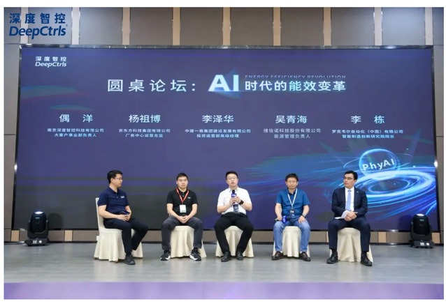 研讨会尾声,京东方科技集团有限公司厂务中心运营总监杨祖博、中建一局集团建设发展有限公司投资运营部高级经理李泽华、维信诺科技股份有限公司能源管理负责人吴青海、罗克韦尔自动化(中国)有限公司智能制造研究院院长李栋与深度智控大客户事业部负责人偶洋围绕"AI时代的能效变革"展开深度对话。