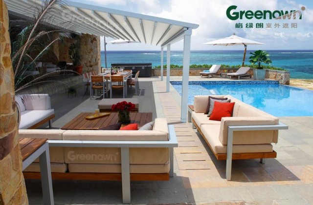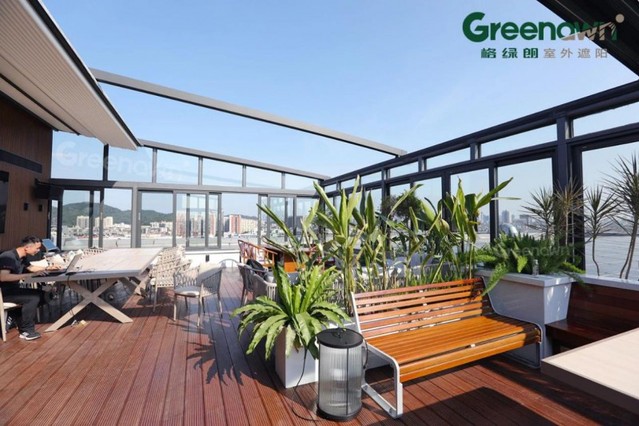 格绿朗率先引进全新一代PERGOLA室外遮阳技术,采用高强度铝合金骨架与顶级PVDF面料复合工艺,打造出更大覆盖面积、更高稳固安全的折叠遮阳篷。其外飘伸展可达到24米(中间无立柱情况下),抗风性能达10级以上,通过调节多种功能模式,实现晴天遮阳、雨天避雨、清风纳凉、夜灯氛围等多场景全天候智能守护。