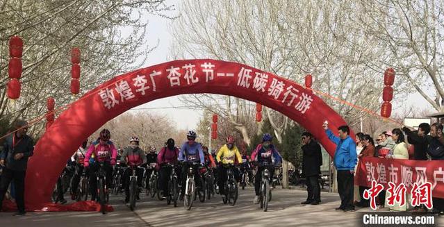 2018年4月1日,敦煌杏花节期间举办低碳骑行游。 艾庆龙摄