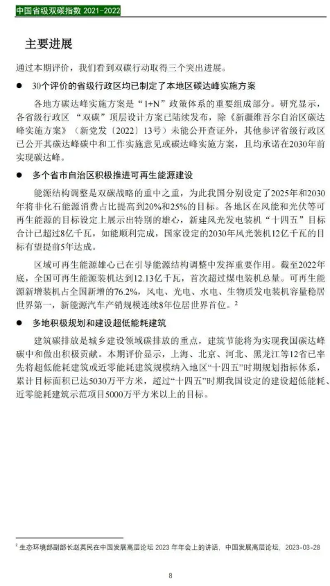 2、通过双碳指数评价,看到双碳行动取得三个突出进展:30个省级行政区均已制定了本地区碳达峰实施方案,能源结构调整是双碳战略的重中之重,建筑节能将为实现双碳目标做出积极贡献;
