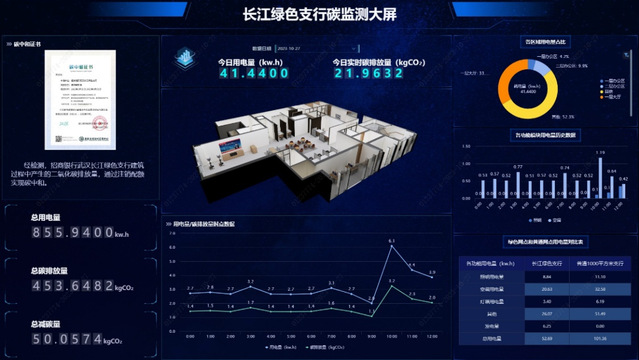 工作做得好不好,数据说话是王道,支行能源管理平台能够自动完成网点用电量采集及碳排放数据换算,实现碳监测可视化。通过碳监测大屏,我们可以直观看到,长江绿色支行能耗相比同面积普通网点降低近50%。