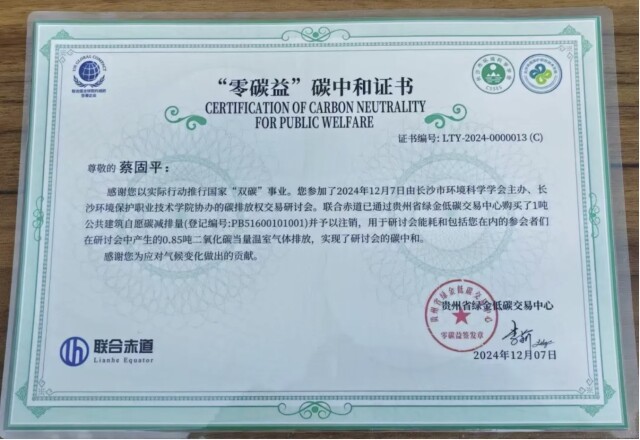 围绕“双碳”和碳排放权交易的技术知识和发展前景,此次2024年碳排放权交易研讨会邀请专业人士进行讲解。研讨会吸引了200多人参加,共产生0.85吨二氧化碳当量温室气体排放。长沙市环境科学学会与参会人员通过贵州省绿金低碳交易中心共同购买了1吨公共建筑自愿碳减排量(登记编号:PB51600101001)并予以注销,实现研讨会“碳中和”,因此,每一位参会人员获得一张“个人碳中和证书”。