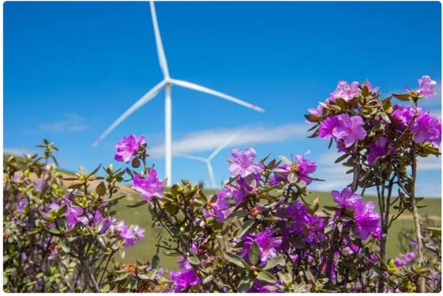 初夏时节,岷县闾井镇海拔3500米的拉木梁上,高低起伏的山岭褶皱间,20台“身高”110米的银白色风力发电机组高高耸立,巨大的叶片随风而动,与绿茫茫的草山相映成景。
