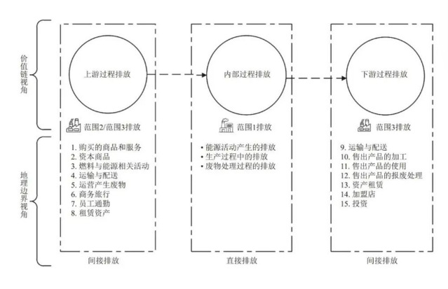 直接排放是指自身拥有或控制的排放源产生的温室气体,通常是指发生在核算对象地理边界内的排放。间接排放不是直接来源于组织自身拥有的或控制的排放源,是指由核算边界内部活动引起、来源于核算边界外部的排放(如蒸汽、电力等能源设施的排放)。该分类体系依据排放源的地理位置进行划分,广泛应用于国家层面以下的层级,包括省级、市级以及企业的碳排放核算。