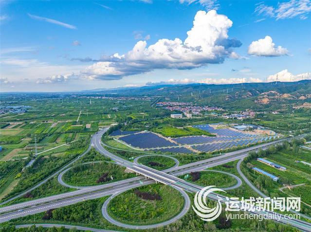 7月1日,盐湖区一处光伏发电站,在高速公路和蓝天白云的映衬下,呈现出一幅绿色和美的生态画卷。