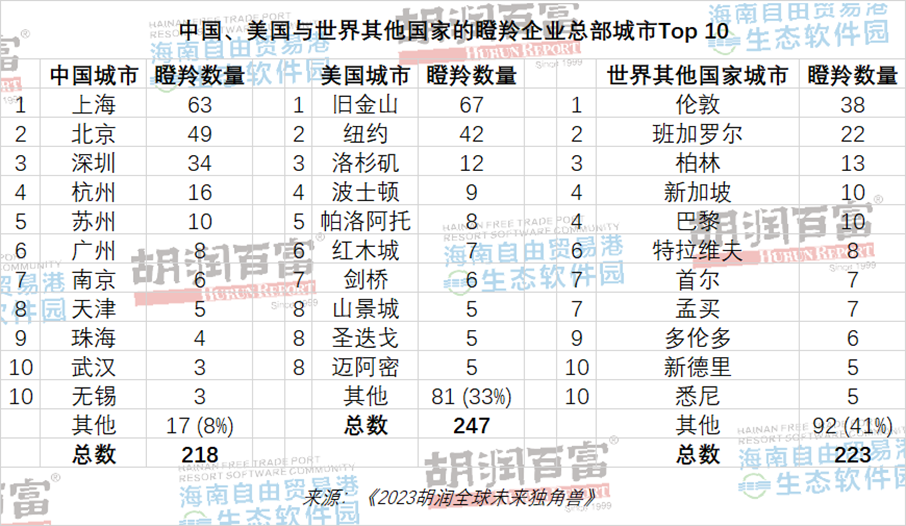胡润研究院数据显示,从未来独角兽分布城市来看,旧金山和上海是全球瞪羚之都,分别有67家和63家,其次是北京和纽约,而在其他地区,伦敦是欧洲的瞪羚之都,有38家,比柏林、巴黎、慕尼黑和苏黎世加起来还要多。