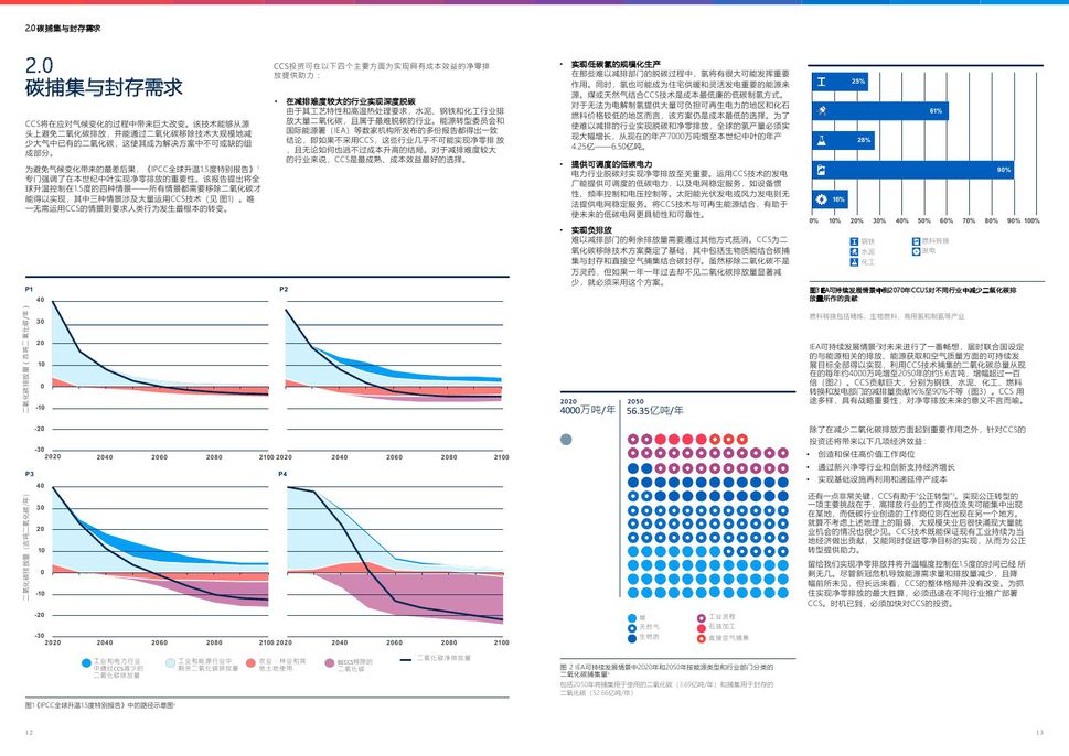 在那些难以减排部门的脱碳过程中,氢将有很大可能发挥重要作用。同时,氢也可能成为住宅供暖和灵活发电重要的能源来源。煤或天然气结合CCS技术是成本最低廉的低碳制氢方式。对于无法为电解制氢提供大量可负担可再生电力的地区和化石燃料价格较低的地区而言,该方案仍是成本最低的选择。为了使难以减排的行业实现脱碳和净零排放,全球的氢产量必须实现大幅增长,从现在的年产7000万吨i增至本世纪中叶的年产4.25亿——6.50亿吨。