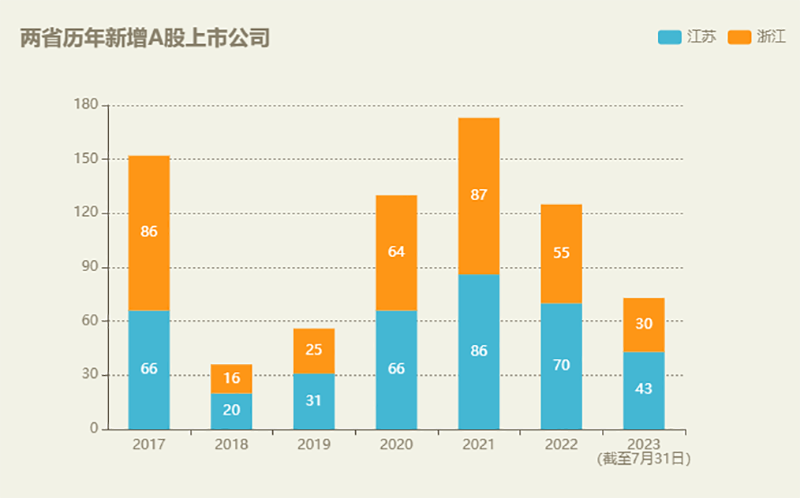 若放大到近五年的标尺来看,江苏的上市公司数有迎头赶上之势——2017年,浙江新增A股上市公司86家,江苏仅66家;2018年至2020年,江苏累计新增数比浙江多出12家;2021年,浙江仅多出1家;2022年,浙江新增55家,少于江苏的70家;截至2023年7月31日,浙江新增A股上市公司30家,江苏达43家。