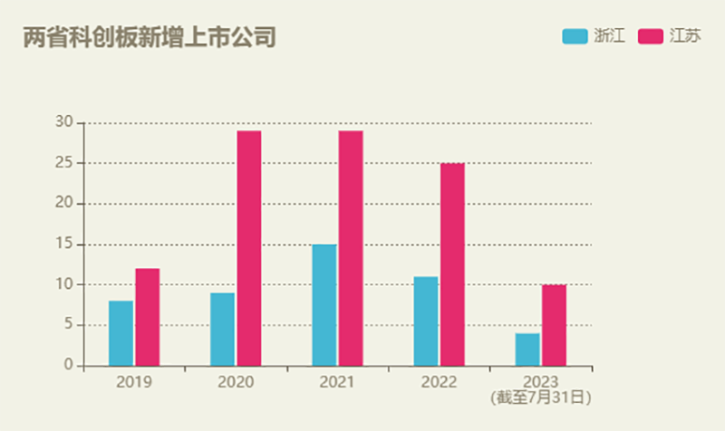 拉长时间轴看,从2019年科创板开市以来,江苏每年的科创板上市企业几乎都是浙江的两倍。