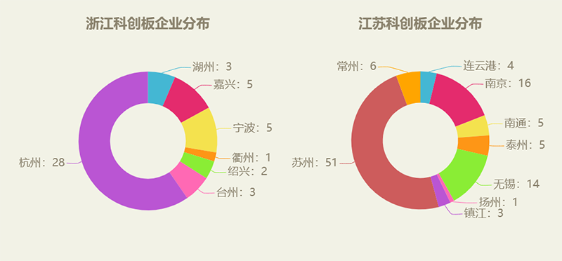 分城市看,江苏的南京、无锡、常州科创板上市企业分别有16、14、6家。而浙江除了杭州,其他城市如宁波、嘉兴、湖州,科创板企业均不超过5家。