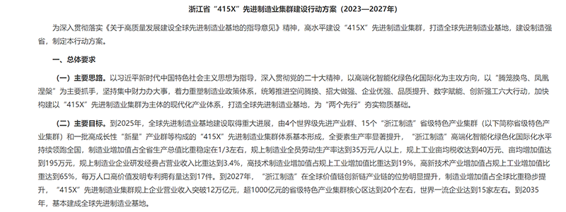 近年来,浙江加码制造业动作不断。今年,浙江发布“415X”先进制造业集群建设行动方案(2023年至2027年),提出到2027年,“浙江制造”在全球价值链创新链产业链的位势明显提升,制造业增加值占全球比重稳步提升,“415X”先进制造业集群规上企业营业收入突破12万亿元,超1000亿元的省级特色产业集群核心区达到20个左右,世界一流企业达到15家左右。到2035年,基本建成全球先进制造业基地。