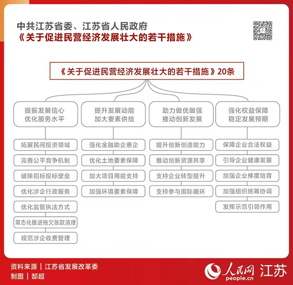 人民网从江苏省政府新闻发布会上获悉,江苏省委、省政府近日印发了《关于促进民营经济发展壮大的若干措施》(以下简称《若干措施》)。瞄准制约民营经济高质量发展的堵点难点,聚焦民营企业“最愁、最盼”,江苏省此次制定出台了“政策带感、企业有感”、充分体现江苏辨识度的政策举措,共包括4个方面20条。