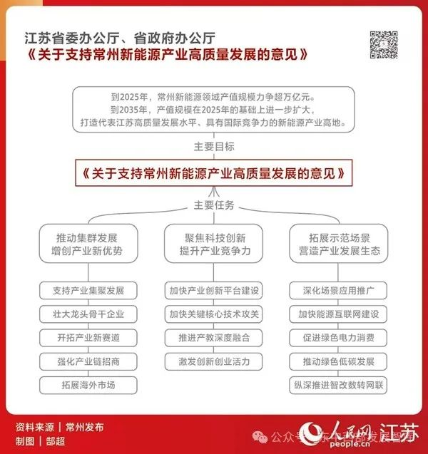 上述《意见》提出,到2025年,常州新能源领域产值规模力争超万亿元。到2035年,产值规模在2025年基础上进一步扩大,发电、储能、输送、应用四大环节实现深层次、高浓度融合发展,新能源在生产、生活中的渗透率处于全国领先地位,打造代表江苏高质量发展水平、具有国际竞争力的新能源产业高地。