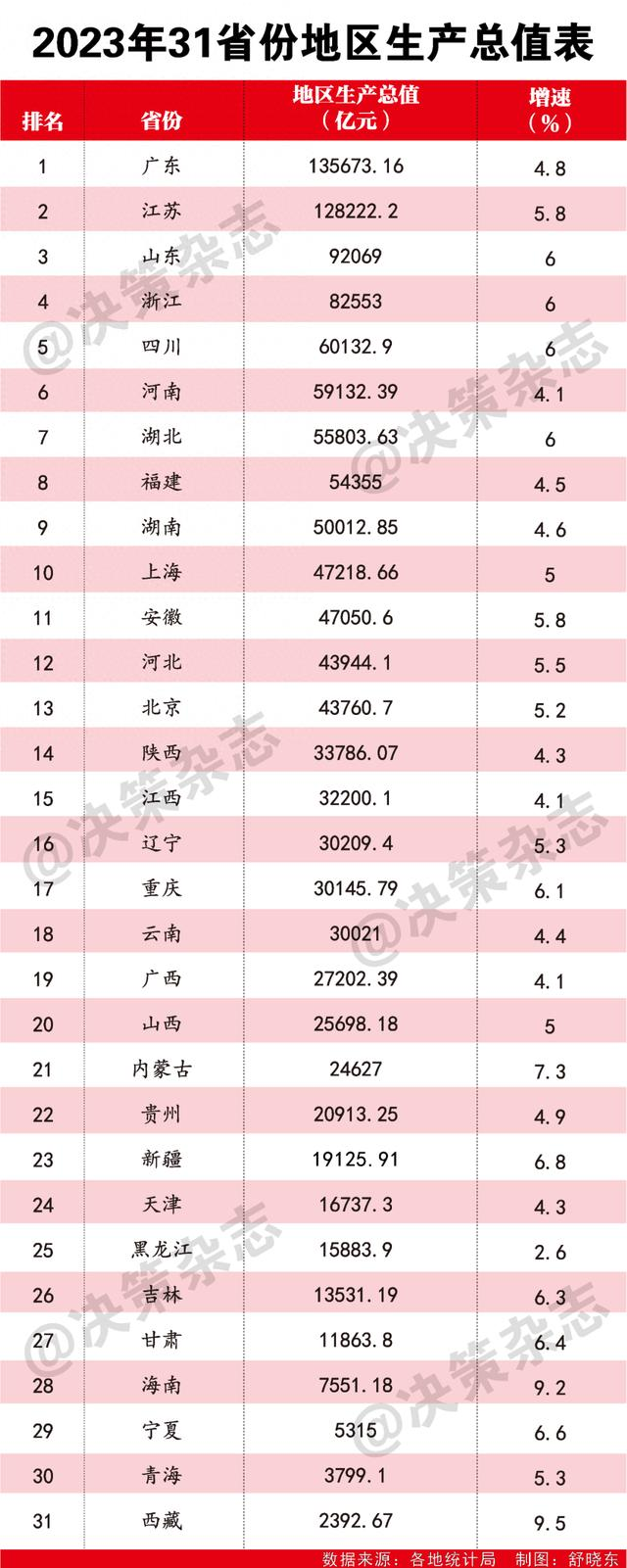 策叔梳理发现,广东、江苏、山东、浙江的地区生产总值稳居前四,四川赶超河南跻身第五。增速上,17省份跑赢“全国线”5.2%,12省份增速达到或超过6%,西藏、海南分别以9.5%和9.2%的增速领跑全国。