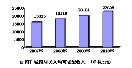 城镇居民人均可支配收入从2007年的15835元,增加到2010年的22635元,年均增长9.34%。