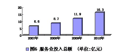 服务业投入从2007年的6.6亿元,增加到2010年的16.3亿元,年均增长25.36%。