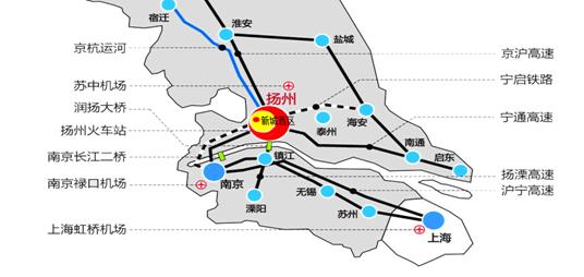 润扬长江公路大桥、南京长江二、三桥、江阴长江大桥和即将建设的五峰山公铁两用大桥使长江不再构成融入苏南的障碍,京沪高速公路、沪宁高速公路、西北绕城和沿江高等级公路极大的改善了对外交通。淮扬镇铁路将于2010年开建,2014年通车。京沪高铁于2008年4月开工,已于2011年6月通车,它使扬州到北京的时间缩短为4小时,到上海经沪宁城铁仅需1 小时。航空方面,距离规划建设中的苏中机场只有30分钟路程,距南京禄口国际机场约1个小时路程,距上海虹桥国际机场约1个小时路程。交通区位优势凸显。形成了以水路、公路、铁路为主体的陆上综合交通体系。