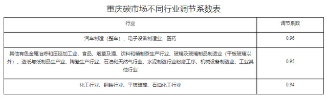 综合考虑我市经济社会发展状况、“33618”现代制造业集群体系发展,“十三五”期间配额发放情况以及行业减排潜力、企业历史碳排放趋势等因素,纳入重庆碳市场的各行业调节系数见附件4。