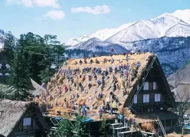 白川乡合掌村自然村落中的茅草屋建筑,全部由当地山木建造且不用一颗铁钉,能保留至今确实很不容易。1965年曾发大火烧毁了一半以上的茅草屋建筑,村里有三四人主动带领大家重建家园,开始了一场保护家园建筑茅草屋的运动。由此,继承和发扬了合掌村的一个历史传统:每家都有囤积茅草的习惯,凡是一家房屋需要更换新茅草屋顶,家家户户携带自家囤积的茅草来相助并参与更换屋顶的工事,一家更换新屋顶只需要一天就可以全部完工。大家把合掌建筑称之为“结”的力量。