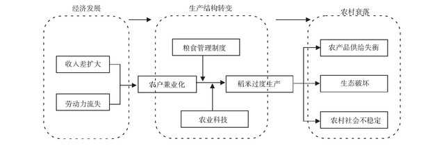 然而,稻米的过度生产带来一系列农村发展问题(见图1)。首先,农产品供给严重失衡。1966—1970年、1974—1979年分别出现了两次规模较大的大米过剩现象,1971—1974年间总共处理了740万吨过剩大米,损失高达1万亿日元[7]。与之相对,小麦、豆类及砂糖类农作物的生产空间被挤压,产量急剧减少,自给率从1965年的28%、25%和31%下降到1975年的4%、9%和15%[8]。而国民饮食习惯从“饱食化”向“多样化”的升级使得许多农产品的供给不得不依赖进口,农产品进口指数从1960年的100%激增至1975年的430%[9]。其次,长期的稻米连作切断了土壤有机物的循环,降低了土壤微生物的活性,也破坏了稻米品种的多样性,使稻米品种从明治时期的数千种减少到以“越光”为主的10种[10];化学肥料的滥用让农地得不到堆厩肥等有机物的补充,土壤营养成分比例失调,还造成土壤、地下水、湖泊的污染,加上农业机械在田间的行走使土壤踏压增大,农地的物理化学特性被破坏,地力降低,生态环境遭到破坏。最后,由于农村“空心化”“老龄化”不断发酵,村落的资源管理职能难以发挥,景观与风土遭到自然侵蚀,田园生活固有的养老育儿和人格塑造的作用濒临丧失,包含节庆活动、传统行事、风俗习惯在内的农耕文化也逐渐消亡,引发农村社会不安[5]。