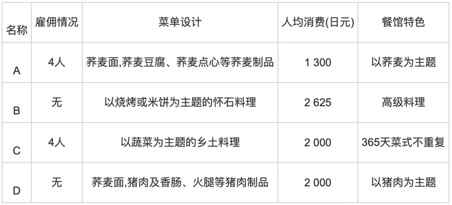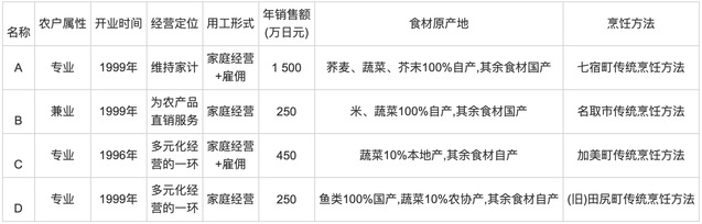 根据表1可知,作为调查对象的4家农家餐馆均为家庭经营,是农户自主创业的表现。餐馆所用食材和调味品大部分来自于自产或地产,其余为国产,显露出经营者对国产农产品的重视和珍爱之情,是与消费者“国产即高品质”消费需求的有效对接。餐馆对食材的加工处理均采用当地传统的烹饪方法,体现了经营者对地域饮食文化强烈的继承意愿和弘扬意识,强化了餐馆借乡土料理传递乡土情的基调。餐馆年销售额为250万~1500万日元,跨度较大,原因在于经营定位不一样:A餐馆作为农户家庭收入的主要经济来源,规模大,年销售额高;C餐馆和D餐馆是家庭多元化经营的一环,经营者对其经济性的重视程度稍弱,且经营者为专业农户,在农忙时期时常休业或采取预约制,经营时间相对较短,年销售额较低;B餐馆为兼业农户经营,作为农产品直营店的附属设施,经营规模小,年销售额也较低。