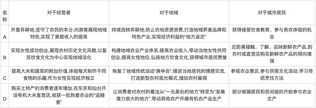 从表5可以得知,从经营者立场上看,农家餐馆的经营让其坚守农民身份,直面农村发展困境,独立思考解决之道,主动创新经营模式、延伸服务半径,推动当地优势资源与加工业、服务业有机融合,培育壮大特色产业,释放农村多元价值,向社会展示农村良好的风貌,既提高了家庭收入,又实现了人生理想,消费者的赞誉还助其提振发展信心,农村振兴的主体地位得以体现。对于地域来说,农家餐馆的经营涉及农产品生产、加工、流通、销售和服务环节,构成一个完整的农业产业链,产业链上下游之间所结成的原料供给与需求、资金投入和产出关系促使当地居民为更好处理彼此间的交易和利益分配问题不断沟通交流,强化亲缘和邻里关系,重新构筑起浓厚的人际关系网,维护农村社会秩序。与此同时,通过在当地雇佣人手和采购食材原料,获得生产诱发效果和雇佣诱发效果,把农产品附加价值增加部分“锁”在农村,将经营收入的一部分“返还”给当地居民,助推农村集体增收。此外,农户在经营过程中通过资源与技术、创意的结合,用不断更新的产品和服务来创造市场,引领消费升级,促使地域经济稳定向好。作为消费者的城市居民,通过对农家餐馆产品和服务的购买,获得走进自然、亲近农民、体验农业的机会,从中学习农业知识和传统民俗文化,了解“三农”的内涵与发展新趋势,在农村发展变化中汲取正能量,维持稳定健康的精神与心态。通过激发农户活力、培育特色产业、传播与实现地域价值,农家餐馆经营引发了农村振兴的蝶变效应。