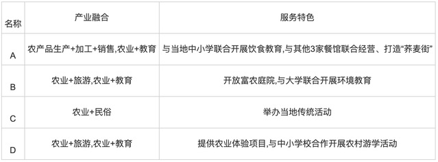 除美食外,4家农家餐馆还提供多种特色服务,实现产业融合(参见表4)。继A餐馆后,七宿町陆续成立了3家荞麦主题餐馆,与A餐馆共同构成了七宿町的“荞麦街”,以经营联合体的形式打造荞麦区域品牌。自2000年起,A餐馆联合当地中小学校开展以荞麦制作体验为主的食品教育活动,每年举办4次,每次参加人数约为200人,通过该活动激发学生了解农村、爱护农业的兴趣,助其养成珍惜食物的习惯。同样是开展“农业 教育”,B餐馆将富农庭院对外开放,为公众创造了解“乡村记忆”的机会,还利用周边防护林,与宫城教育大学联合开展环境教育活动,推动饮食文化、生态环保和休闲教育有机结合。C餐馆则是强调农业与民俗文化的结合,牵头举办地域传统活动“庚申会”,每年3次,召集留守老人聚在一起喝茶饮酒,延续地域传统习俗。D餐馆则是提倡“将农村的生产生活如实向城市居民展示”,提供一系列完整的食物制作和务农体验活动,通过游学项目让中小学生在农家“吃、住、劳”,开展“浸入式”农业教育,每年吸引约3000名学生与家长参与。