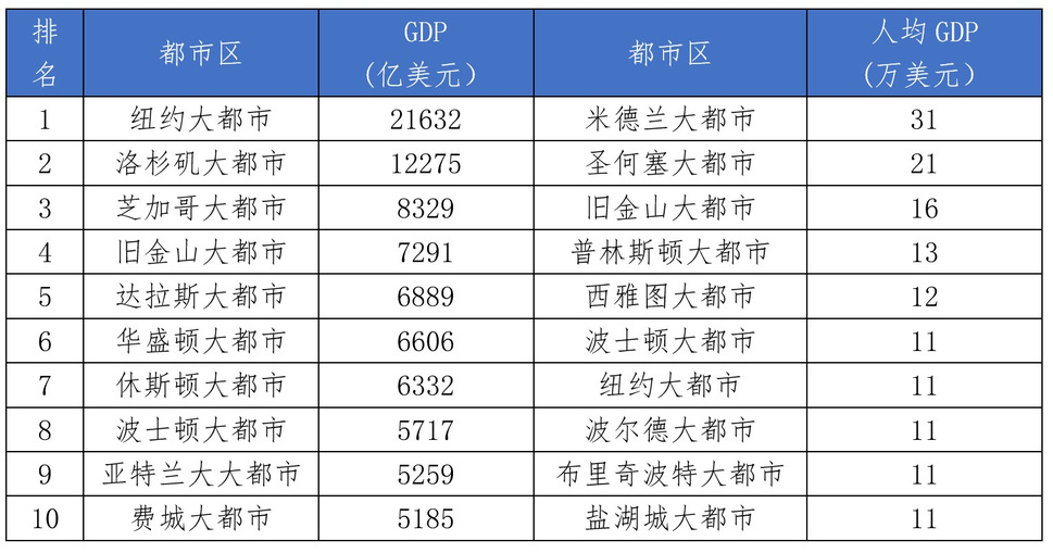 表2 2022年美国城市中GDP最高和人均GDP最高的10座都市区