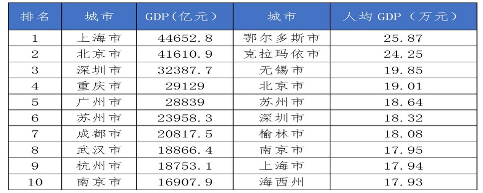 看到这个问题,相信很多人的答案都是,不一定。从中美城市GDP和人均GDP的前10位城市来看,确实是“不一定”。比如国内GDP最高的城市是上海,而内地人均GDP最高的城市却是鄂尔多斯,2022年其人均GDP高达25.87万元,是上海(17.99万元)的1.4倍左右。此外,克拉玛依、榆林和海西等城市在地区生产总值的规模上并不占优势,而由于是资源型城市,资源交易规模大,所以人均GDP能够进入全国前10。而北京、上海、深圳、苏州和南京五座城市不仅GDP总量高,人均GDP总量也高。