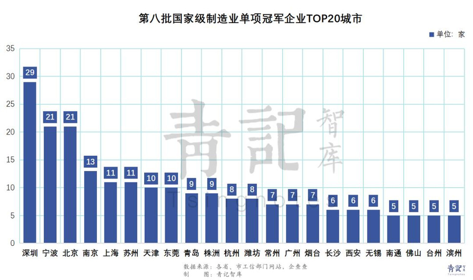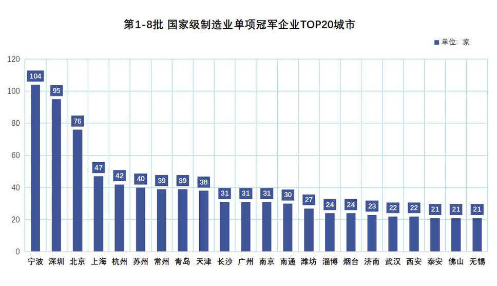 至此,前8批制造业单项冠军企业总量排名前十的城市依次是:宁波(104家)、深圳(95家)、北京(76家)、上海(47家)、杭州(42家)、苏州(40家)、青岛(39家)、常州(39家)、天津(38家)、南京(31家)、广州(31家)和长沙(31家)。