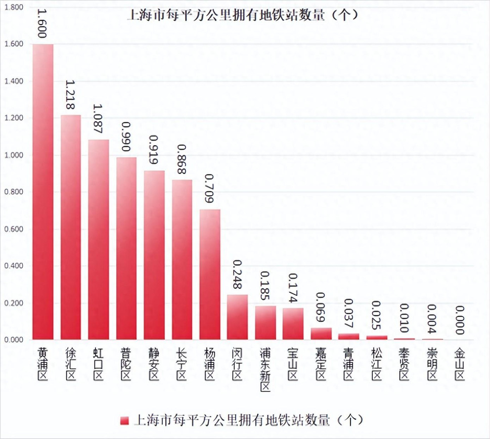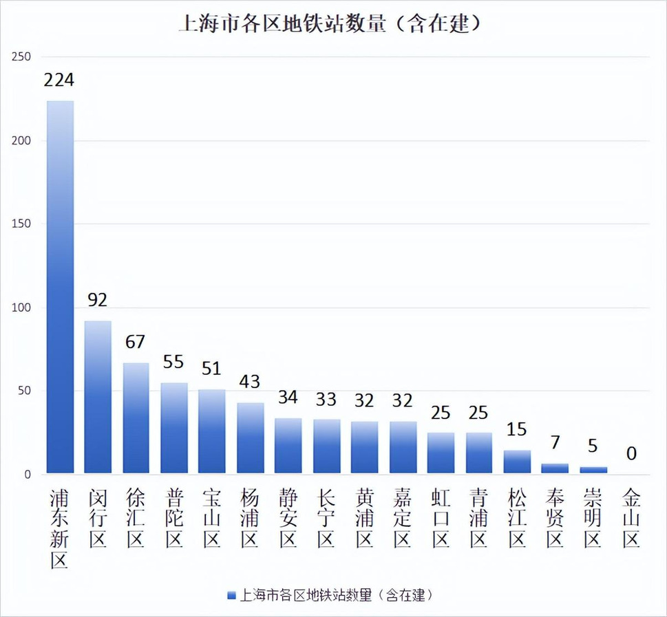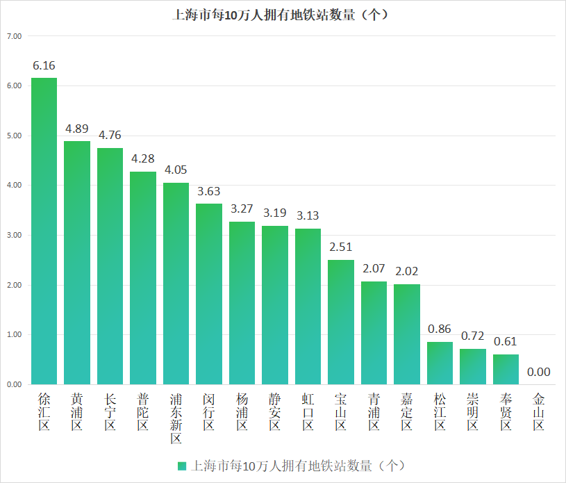 徐汇区每10万人拥有的地铁站最多,松江、崇明、奉贤处于同一水平,金山已被遗忘