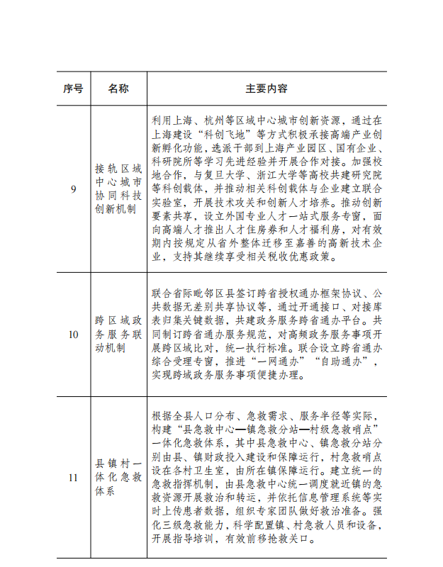 《意见》提出,支持共建长三角生态绿色一体化发展示范区跨省域高新技术产业开发区,争创国家高新技术产业开发区;支持嘉善建设国家创新型县,试行申报“尖兵”“领雁”研发攻关计划项目的推荐名额单列,支持注册省自然科学基金依托单位;指导嘉善统筹构建乡村产业发展、乡村建设和乡村治理一体设计推进机制等内容,以点带面破解县域高质量发展共性问题,为全国县域高质量发展提供浙江样板等。